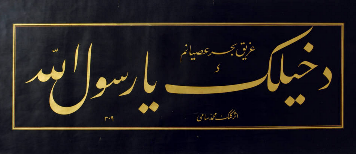 Dahilek Ya Resulallah SÂMİ EFENDİ Pertevniyal Vâlide Sultan Camii’nin yerinde olan Kâtib Mustafa Efendi Camii Mektebi’nin hat hocası Boşnak Osman Efendi’den sülüs-nesih yazılarını meşkedip icâzet aldı.Ta‘lik hattını Kıbrısîzâde İsmâil Hakkı Efendi’den meşkedip 1857’de icâzet aldı. adı güzel kendi güzel Muhammed’e Dahilek ya Resûlallah! diyemeyene acınır. Garibim NASİPSİZDİR. Perişan bir niyaz inler hayatım. Dahilek Ya Allah. Şefaat Ya Resulallah. Himmet Ey Erenler.